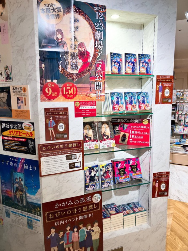 累計160万部突破の2018年本屋大賞受賞作、辻村深月さんのベストセラー小説「かがみの孤城」12月23日(金)より、劇場アニメが公開されるのを記念して、当店にも特設コーナーが出来ました!文庫本の上下巻は、映画化を記念した全面カバー帯に。「かがみの孤城」を(単行本・文庫・キミノベルどれでも)1冊購入で1枚「きらきら特製ミラーカード」プレゼント。店内に隠された7人のキャラクターパネルを探してNFTデジタルカードを集めていただくと「オオカミさま」のメッセージカードをお渡しする「ねがいの叶う鍵探し」イベントも実施中です。ぜひご参加ください!