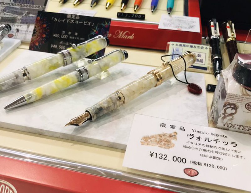 イタリアのペンブランド「アウロラ」のフェアを開催いたしております。期間中万年筆、ボールペンをお買い上げのお客様にインクと替芯をプレゼントいたします。人気の定番のペンに加えて万華鏡の色彩を全身で表現した「カレイドスコーピオ」、美しいイタリアの街並みを表現した「ヴォルテッラ」といった珍しい限定品も入荷いたしました。この機会に是非お越し下さいませ。