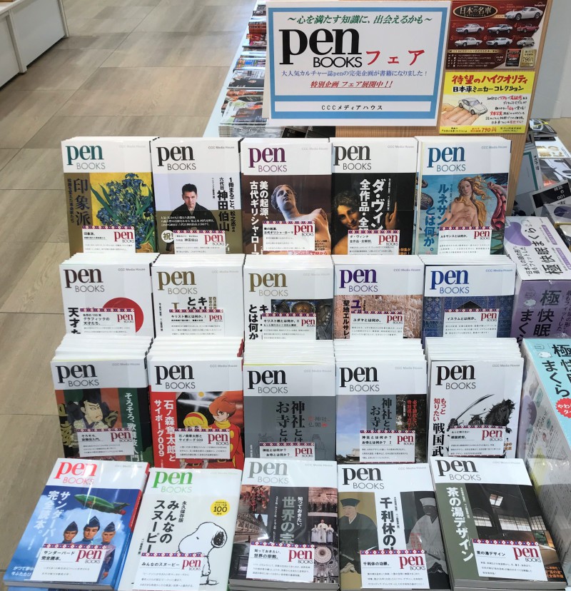 カルチャー誌Penで好評であった特集を書籍化した「PenBOOKS」のフェアを開催しております。こちらのフェア商品ですが、本誌がすべて完売したラインナップで構成されており、Penの特徴でもある人文・芸術系の商品が多数です。すべてオールカラーであるためプレゼントにもおすすめ。カルチャー雑誌コーナー近くで展開しておりますので、ぜひ起こし下さいませ。