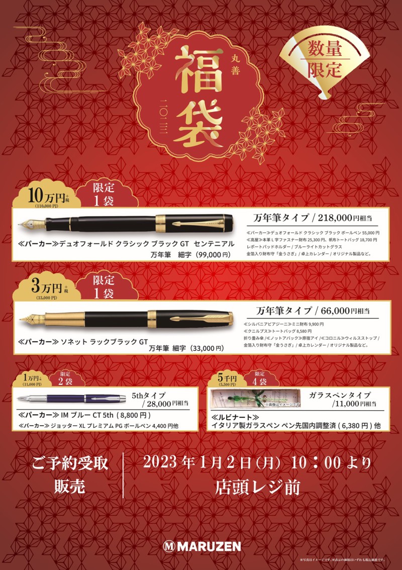 3万円「パーカー万年筆」は限定1袋。パーカーは1888年創業の英国の高級筆記ブランドメーカーで、クリップに特徴のあることでご存知の方も多いかと思います。「万年筆ははじめて」というお客様にも、『丸善萬筆友の会』のサポートがつきますので、特におすすめです。