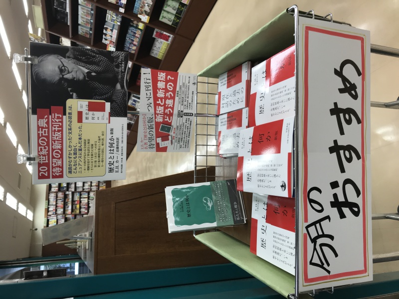 今月は、E.H.カー『歴史とは何か 新版』(岩波書店)。「文系の必読書」と言われるほどの名著でありながら通読が難しかった本書が、2022年に新版として刊行されました。1962年発売の新書版との違いは、新訳であることと、カーが生前に遺した序文・自叙伝・訳者解説などの大幅増補があること。特製ブックガイドも配布中ですので、どうぞお立ち寄り下さい。