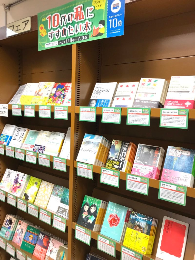 「10代の時の自分」 に対して、あのときこの本を読んでいれば……という視点での読者アンケートの回答から50タイトルを選んで、熱い思いのこめられたコメントとともに紹介する「10代の私にすすめたい本」フェアを開催。不安や悩みと隣り合わせの10代という年頃に、一時でも安心感をもたらし、向かうべき道をほのかに照らしてくれるのが「本」なのではないかと書店員は信じています。50冊=50人が選んだ本を通して「10代の私」に伝えたかったことから垣間見える人生にも、きっと物語が感じられるはずです。緑橋通り側階段近くのフェアコーナー(文庫・新書の話題書コーナー近く)で展開しています。どうぞお立ち寄りください。