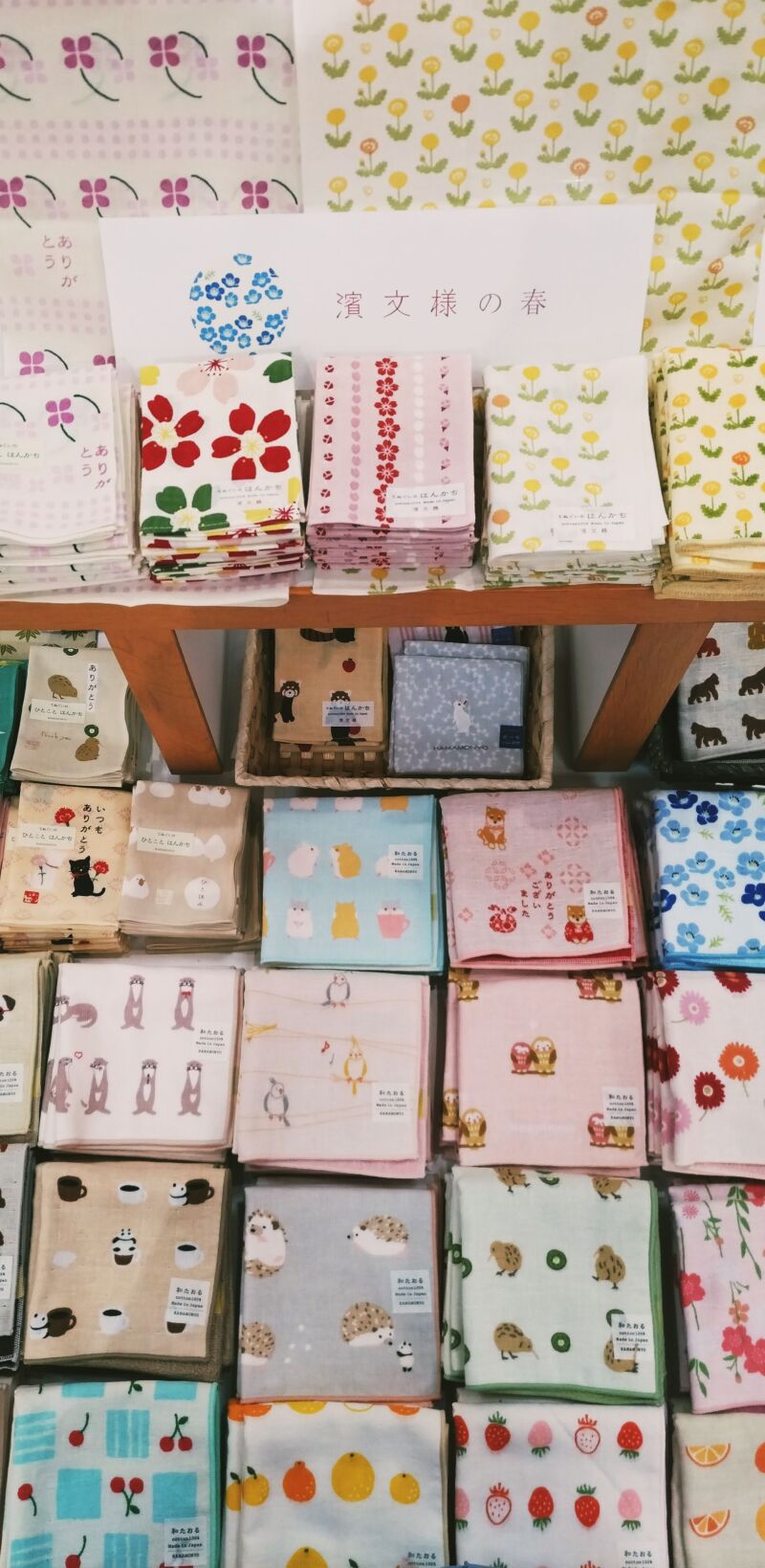 和たおるが人気の濱文様の春柄が入荷いたしました。当店でもオープン当時から定番商品となっております。老若男女に好かれる柄で、触り心地も気持ちが良いです。お値段も550円と手頃なので、ちょっとした贈り物にもおすすめです。最近ではクオッカやカンガルーなどのオーストラリアの動物が続々発売してます。さくら柄は種類も豊富で、ピンク色が気持ちをあったかくしてくれます。店内は少しずつ春へ衣替えをしております。ぜひお立ち寄りくださいませ。
