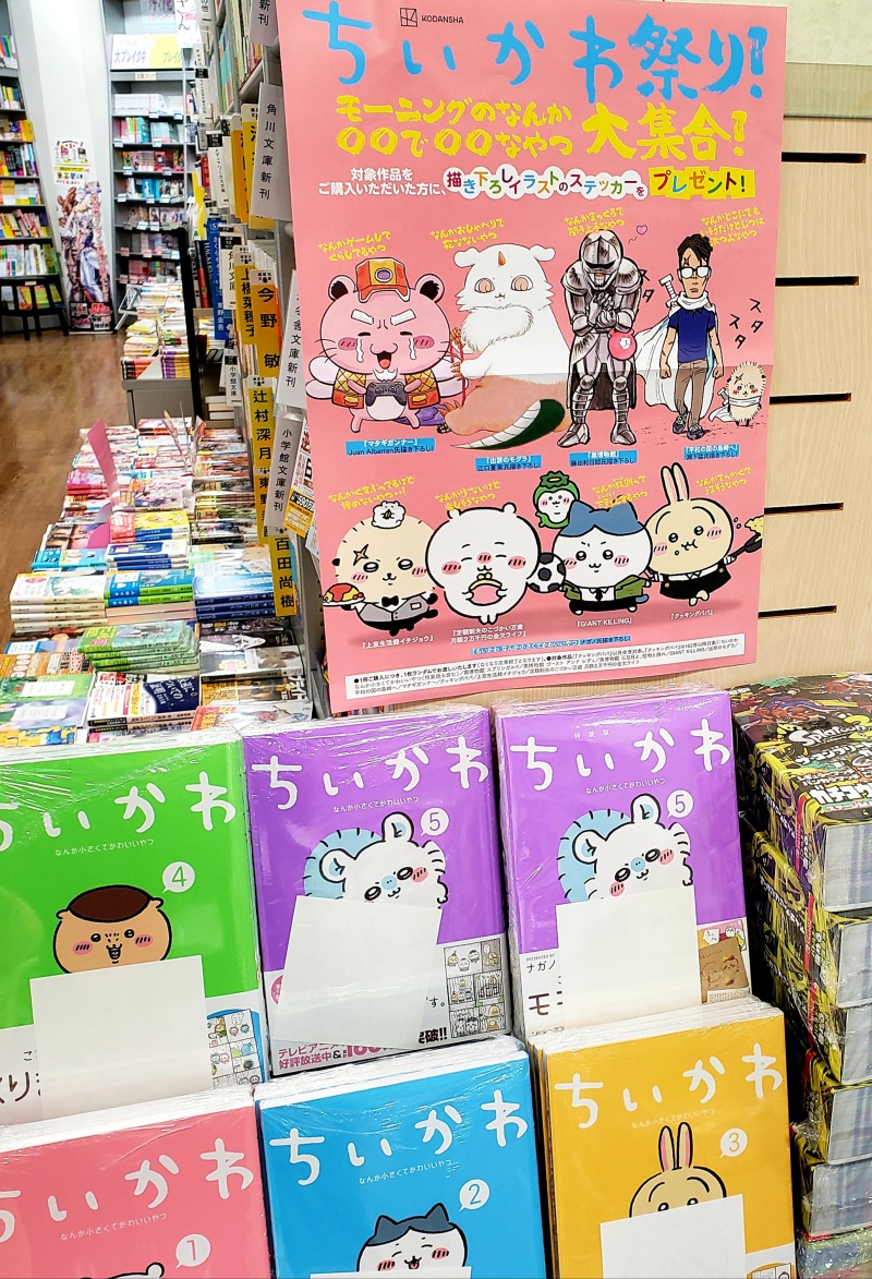 大人気のちいかわがモーニング(講談社)の人気作品とコラボ!ちいかわ1巻から5巻をはじめ、「GIANTKILLING」(ツジモト)や「出禁のモグラ」(江口夏実)など対象商品には「ちいかわステッカー」が1枚ついてきます。絵柄はお選びいただけませんのでご了承ください。なくなり次第終了。この機会に是非、当店にお越しくださいませ。