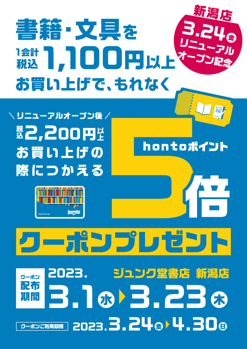 リニューアルオープン記念|書籍・文具を税込1,100円以上お買い上げでhontoポイント5倍クーポンプレゼントキャンペーン(新潟店)