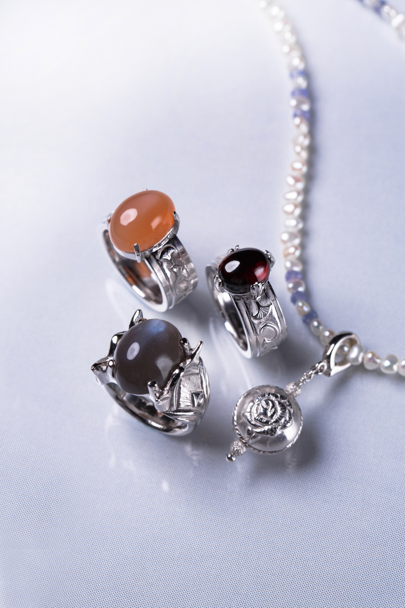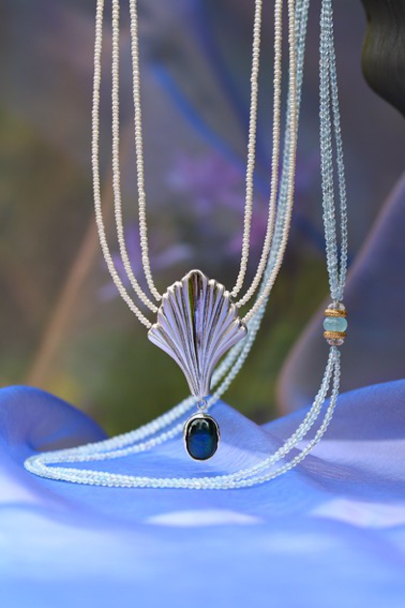 〈Maria Maria〉四季折々の美しい草花や水の流れ、空に浮かぶ雲など自然美をモチーフとしたデザインに金、銀、プラチナ、それぞれの持ち味を生かしたオリジナルジュエリーです。写真の商品は、夜空のような濃紺のスペクトロライトと淡水真珠を組み合わせたタイプと爽やかなアクアマリンとゴールドのロングの3連ネックレスになります。
