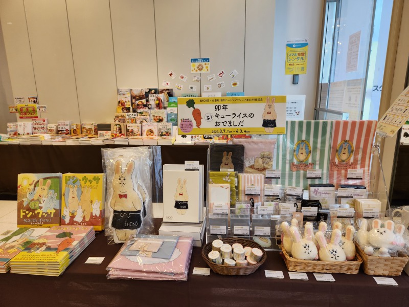 キューライスさんの新刊絵本「ニンジンジン」。ニンジンジンとウサギの追いかけっこが楽しい絵本から、刊行記念フェアのグッズが入荷しております。EHONS オリジナルのドン・ウッサのステーショナリーや、クッション、ぬいぐるみキーホルダー等を多数販売しております。お買い上げの方にはレジにて先着でポストカードをプレゼントしております。