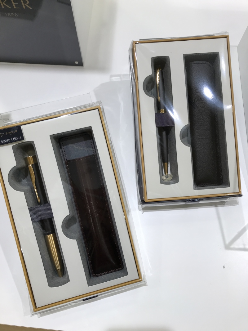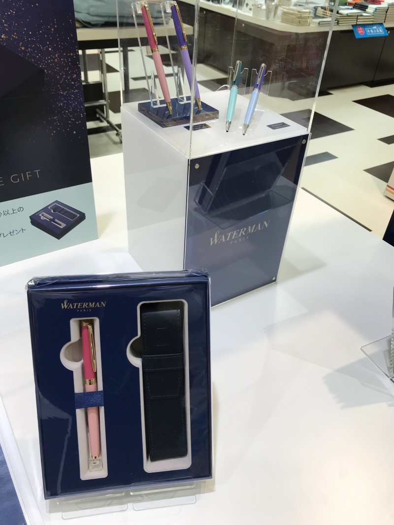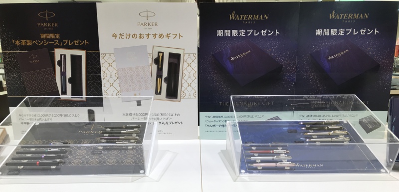 パーカー・ウォーターマンフェア開催中です。パーカーでは、握りやすさを重視した人気モデルの「アーバン」や、大ぶりで高級感のある「インジェニュイティ」の万年筆などを展示しております。また、ウォーターマン「メトロポリタン」シリーズより新色のボールペン・万年筆もご案内しております。新しい季節を感じさせるような、かわいいカラーが特徴です。パーカーでは5500円(税込)以上、ウォーターマンでは11000円以上の製品を御購入のお客様に、今だけ限定のペンケース付きギフトBOXをプレゼント。贈り物におすすめいたします。