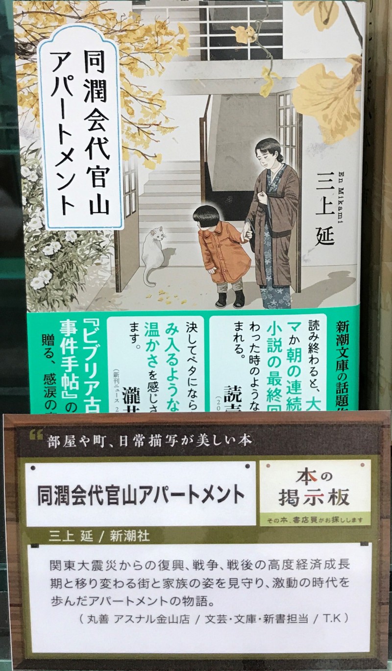 担当おすすめに三上延『同潤会代官山アパートメント』(新潮文庫)関東大震災で妹を亡くした八重は妹の婚約者・竹井と結婚し、同潤会代官山アパートメントへ…。時代の激流に翻弄されながらも心通わせる相手と出会い、家族をつくり、支え合って生きてきた四世代、70年の歴史を描く。