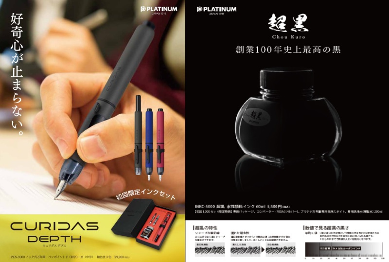 プラチナ万年筆より、CURIDAS DEPTH(キュリダスデプス):ノック式万年筆「キュリダス」の新ラインナップと超黒インク:プラチナ万年筆史上、最高の黒さを誇る万年筆用ブラックインク「超黒」が5月に発売されます。キュリダス デプスは、不透明、ラバー塗装軸採用で20ml瓶インク、コンバーター、カートリッジがセットになった限定パッケージ仕様、超黒インクはコンバーター、洗浄液(精製水)250ml、洗浄用スポイトが付属する初回限定仕様です。(初回限定パッケージはなくなり次第終了いたします。詳しくは係員までお問い合わせください)【1F万年筆売場】