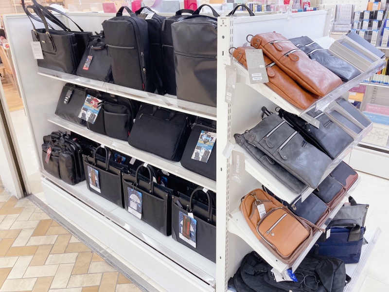 1階カフェ横のイベントスペースにて、男性向けバッグのセールを開催中でございます。