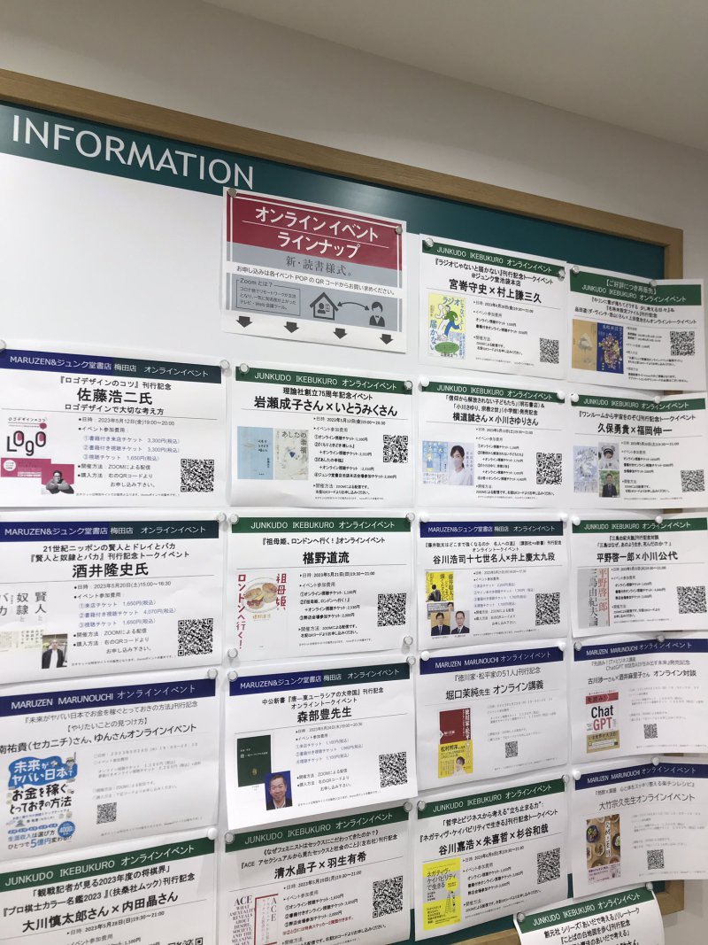 3階エレベーター横の掲示板に、ジュンク堂書店池袋本店・丸善丸の内本店・MARUZEN&ジュンク堂書店梅田店等が主催するオンラインイベントのご案内を常時掲示しています。