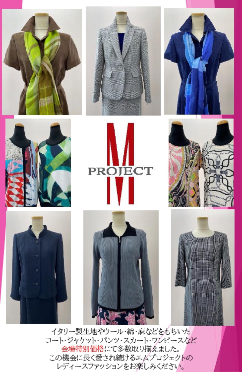 タリー製生地やウール・綿・麻などをもちいたコート・ジャケット・パンツ・スカートなど会場特別価格にて多数取り揃えました。 この機会に長く愛され続けるエムプロジェクトのレディースファッションをお楽しみください。