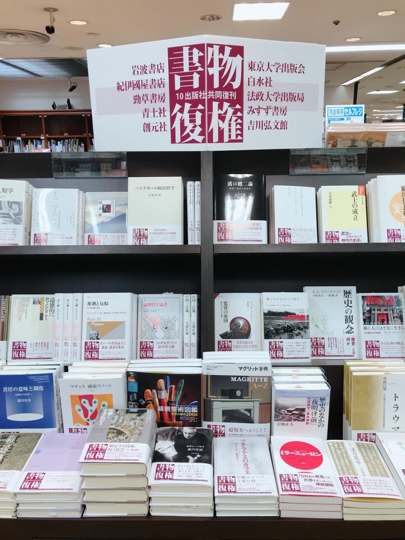 10社合同の書物復権フェアがはじまりました。絶版や重版未定などで品切れしていた書籍が、みなさまからの投票により待望の復刊です。いつの時代に読んでも色褪せることのない、哲学・道徳・倫理を知ることが出来る、たくさんの名著。本は新たな価値観を与えてくれて、私たちの世界が広いことを教えてくれます。出会う機会が少なくなってしまっていた多くの書籍が、復刊によりまたみなさんの目に触れる機会が増えるのは、書店としても大変うれしく思います。是非ご覧下さいませ。