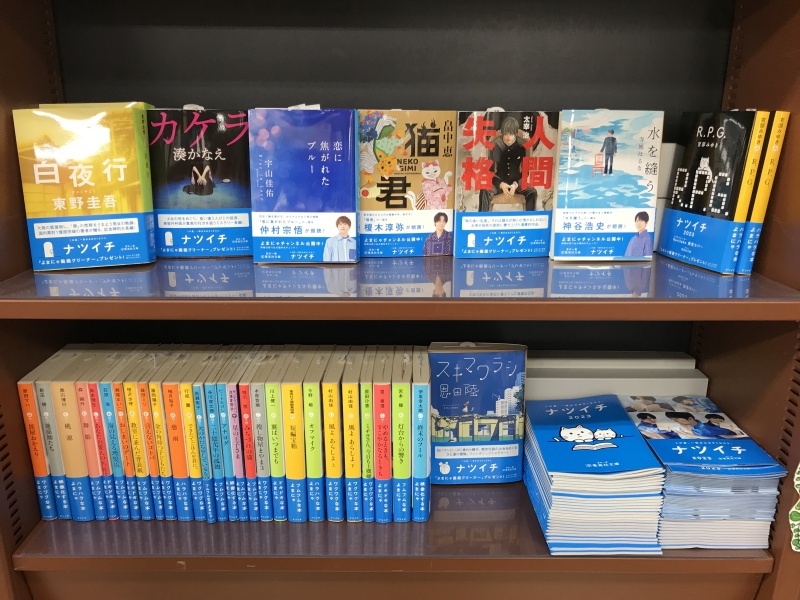 青い背景に白い猫ですっかりお馴染みの、集英社の夏の恒例フェア「ナツイチ」。テーマは「この夏、一冊分おおきくなろう。」。あなたの感情を豊かにしてくれる名作がずらりと勢揃い。対象商品をご購入のお客様に、レジカウンターにてよまにゃ画面クリーナーを1冊につき1点プレゼントしています。絵柄は全4種類。なくなり次第終了ですので、どうぞお早めに。レジ側入り口を入ってすぐ左、列「フェア」の奥の棚と、集英社文庫の棚にて対象商品をお取り扱いしています。