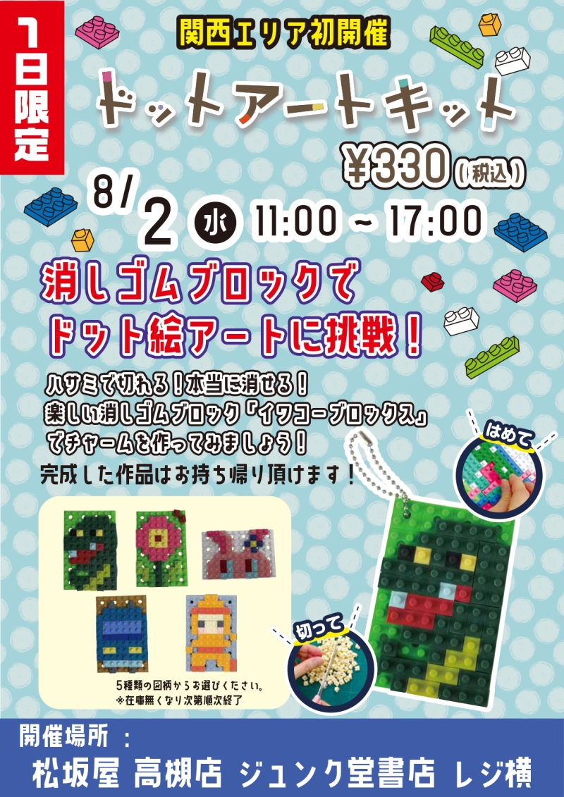 関西エリアでは初開催となりますが、イワコーグローバル主催で「ドットアートキット」イベントを当店で開催いたします。素材が消しゴムでできているブロックを、はめたり切ったりしてドット絵アートに挑戦するイベントで、完成した作品はお持ち帰りいただけます。出来上がった作品はチャームにしたり、もちろん消しゴムとしてもご利用いただけます。1日限定の開催となりますので、レジカウンター前特設コーナーで是非ご参加下さいませ。
