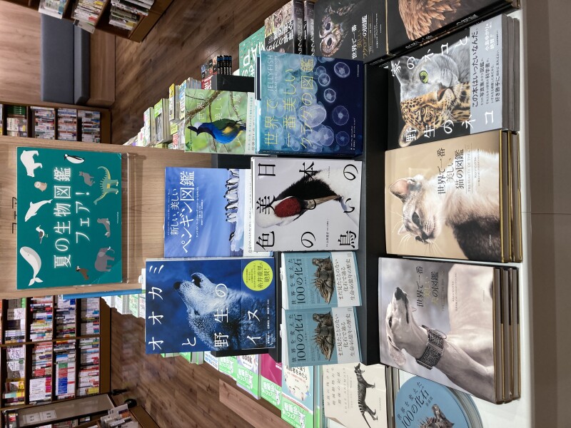 美しい表紙と写真の図鑑は、ただただページを捲りながら眺めているだけでも幸せな気分になりますね。理工書コーナーではそのような大きなサイズの生き物図鑑を集めて「夏の生物図鑑」フェアを開催中です。かわいい猫や犬の図鑑、かっこいい鳥たちの図鑑、涼しげなクラゲの図鑑など、大判ならではの迫力ある図鑑の数々をお楽しみ下さいませ。