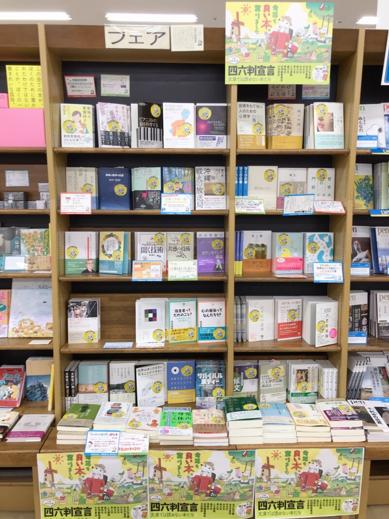 11社合同企画、四六判宣言フェアの季節が今年もやってまいりました。四六判とは現在流通している単行本の標準的なサイズの呼称のひとつです。文庫のように大量生産できないが読み継がれるべき基本図書やロングセラーなど出版社が大切にしている本たちを多くの読者に届けたいというコンセプトにより、毎年開催しているフェアです。今年のテーマは「今年も良い本、実りました」です。各出版社おすすめの書籍を揃えておりますのでこの機会にぜひご来店ください。【エスカレーター上がってすぐフェアコーナーにて開催中です】