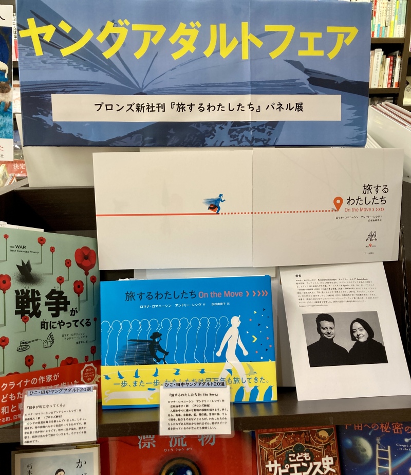 毎年大好評の中学生・高校生を中心とした大人と子どもの境目の世代に向けてのおすすめの本を集めた「ヤングアダルトフェア」。今年は、ウクライナの作家による万物の「移動」を描いた絵本『旅するわたしたち』(ブロンズ新社刊)が発売となったことを記念して、その内容に沿った10代におすすめの本を、児童文学作家のひこ・田中さんと当店児童書担当者が選びました。進化の過程による移動の歴史や、のりものの発明による手段の変化、探検、戦争、避難、巡礼、観光など、様々な目的によって、動くことにより、あたらしい世界をひらいてきたわたしたちの物語です。パネル展も同時開催しております。ぜひご覧ください!