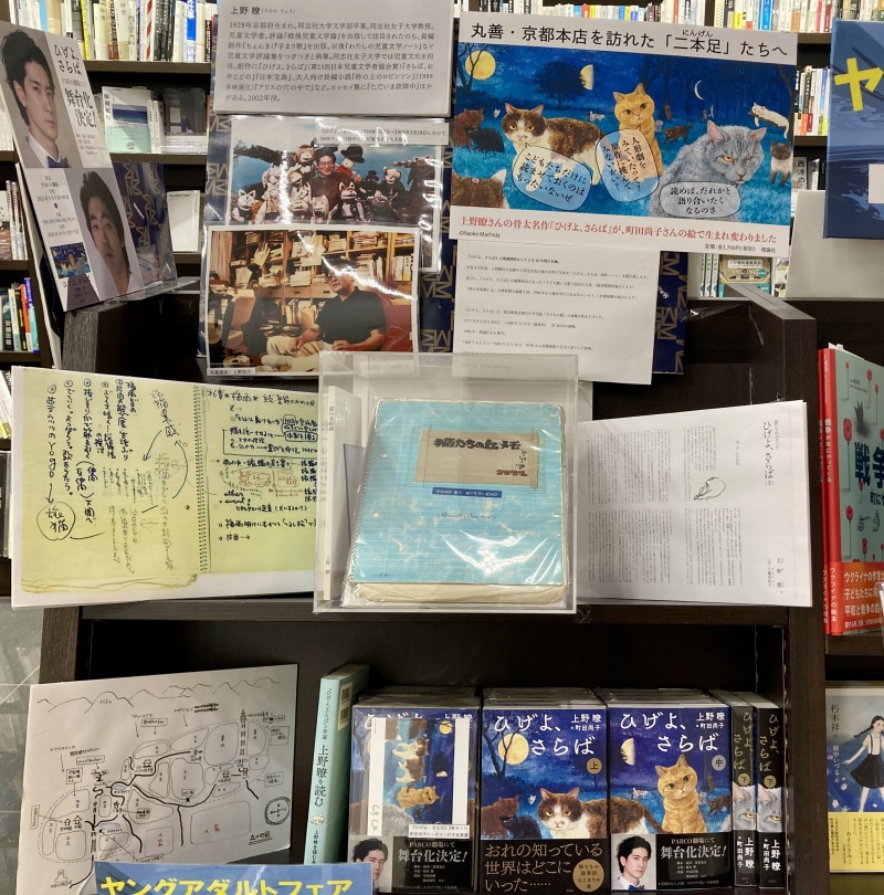 今回のフェアのもう1つの注目作品が、京都府出身の児童文学者・上野瞭さんの名作長編『ひげよ、さらば』(理論社)です。記憶のない猫「ヨゴロウザ」と隻眼の猫「片目」がたどる苦難と喜びに満ちた物語。今回ご子息の上野宏介さんのご協力をいただき、貴重な『ひげよ、さらば 制作ノート』を期間限定で展示しております。制作の過程や、物語の舞台を描いたイラストの他、晩年の上野瞭さんが京都新聞で連載されていたエッセイ『猫の老眼鏡』の写真も展示しております。秋には東京と大阪で舞台化も決定している注目の作品です。この機会にぜひお楽しみください!