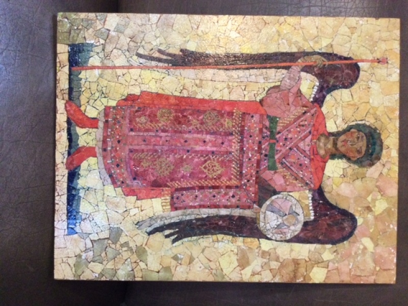 卵殻モザイクは、日本画の顔料で着色した卵のカラを下絵に貼り付けて描くモザイク画です。昭和の初めに山梨県の師範学校の教師、矢崎好幸氏によって考案され、その技法を受け継いだ桑原浜子氏によって多くの優れた作品が制作、発表されてきました。現在では孫の安藤彩子さんがその技法の紹介と普及に努めています。