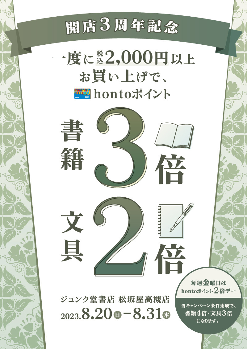 開店3周年記念|一度に税込2,000円以上お買い上げで書籍3倍・文具2倍キャンペーン(松坂屋高槻店)