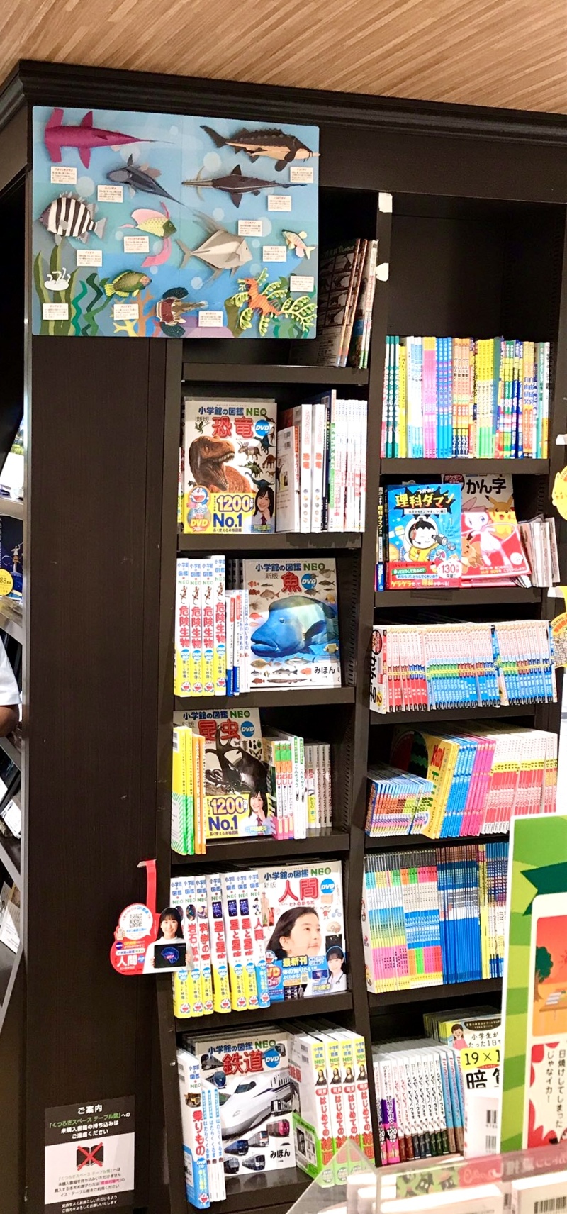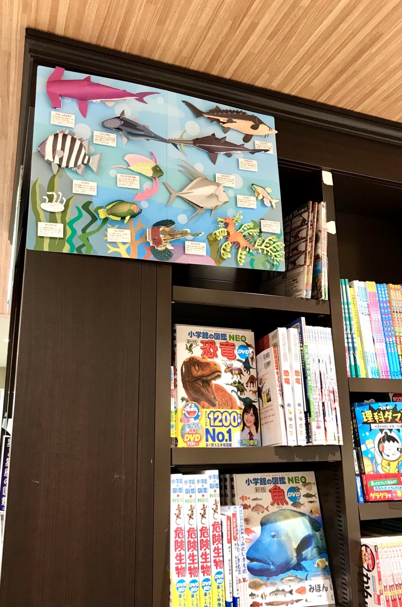 夏休みもラストスパート!自由研究やおうち時間に楽しめる工作や科学のキットをレジ前フェア棚に用意しています。大好きな分野をどっぷり読み耽るもよし、新しいことを調べたり、自由研究にフル活用してもよしと興味の幅がぐんと広がる「図鑑フェア」も隣のフェア棚で同時開催しています。少し難しい立体物にチャレンジできる本も用意していますので、挑戦してみませんか?さかな編のサンプルを掲示していますので是非ご参考に!