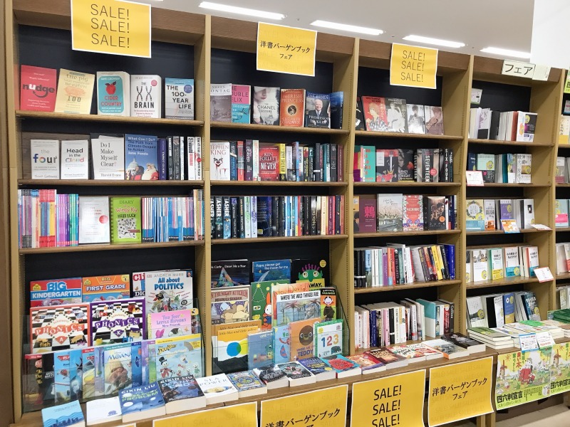 エスカレーター上がってすぐのフェアコーナーにて洋書バーゲンブックフェアを開催中です。