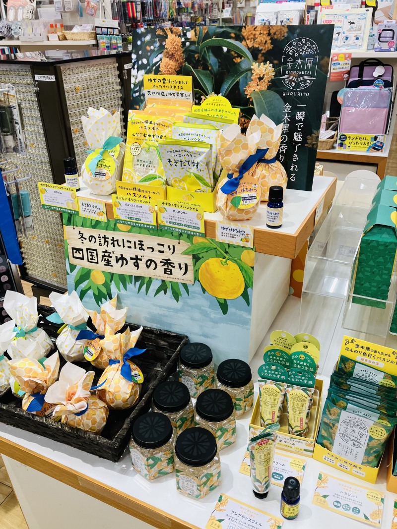 四国産柚子の精油を使ったバスパウダーやゆずとはちみつのバスボム、金木犀の花エキス配合のオイルやフレグランスジェル、ハンドクリーム、バスソルト、疲れた目に気持ちいいはちみつのアイマスクなど仕事や学校終わりに香りで癒やされて落ち着くアイテムを展開しております。ぜひ当店のアイテムでゆったりとした時間をお過ごしくださいませ!ご来店お待ちしております。