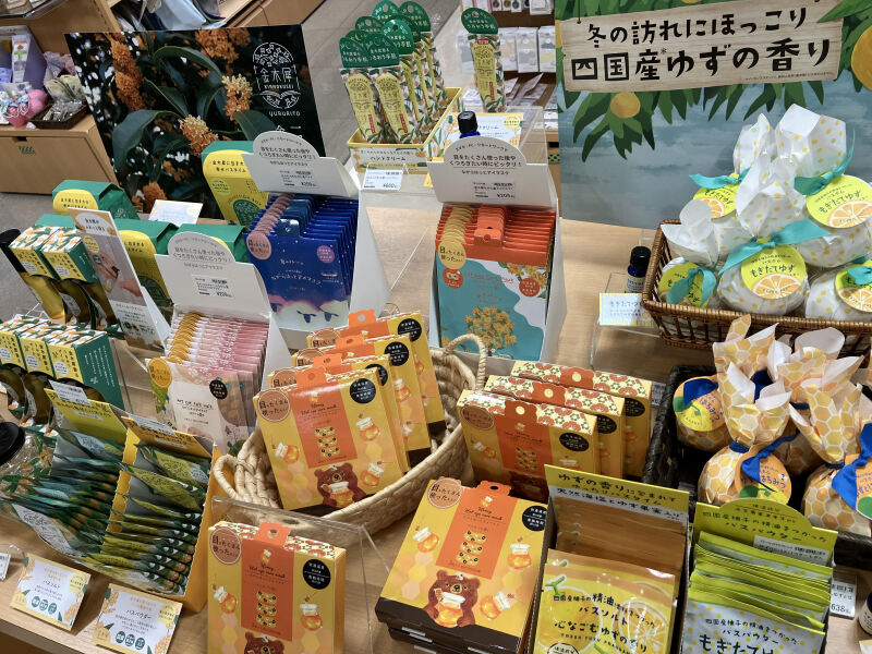 不安をやわらげたり安眠効果のある金木犀、自律神経のバランスを整えると言われているゆず、リラックスと元気をもたらすはちみつ、と香りが持っている効果を活かしたバスソルトやバスパウダー、ホットアイマスクなど、体を温め、ゆるめることで明日の元気を養うグッズがMARUZENに入荷しました。香りだけでなくうるおい成分でもある金木犀の花エキス配合の「ボディ&ヘアオイル」はカサつく季節のお手入れに、四国産のゆずが香るバスボムはすっきり&さわやか「もぎたてゆず」とリラックス&ウォームの「ゆずとはちみつ」の2種類でパッケージも丸い形もかわいらしくバスタイムを楽しくしてくれます。同じ香りのバスソルト、バスパウダーもあります。はちみつやゆずの他にも香りが数種類あるホットアイマスクは3枚入パッケージと1枚入りパッケージの2タイプありますので、お好きな香りだけをストックしたり、気になる香りをいくつかチョイスしたりとご自身に合わせた使いかたができます。ゆずと金木製は香りのテスターを売り場にご用意しています。中央エスカレーター近くのフェアコーナーで展開しています。パッケージデザインや商品の色合いをながめるだけでもほっこりしますので、ご来店の際はどうぞお立ち寄りください。