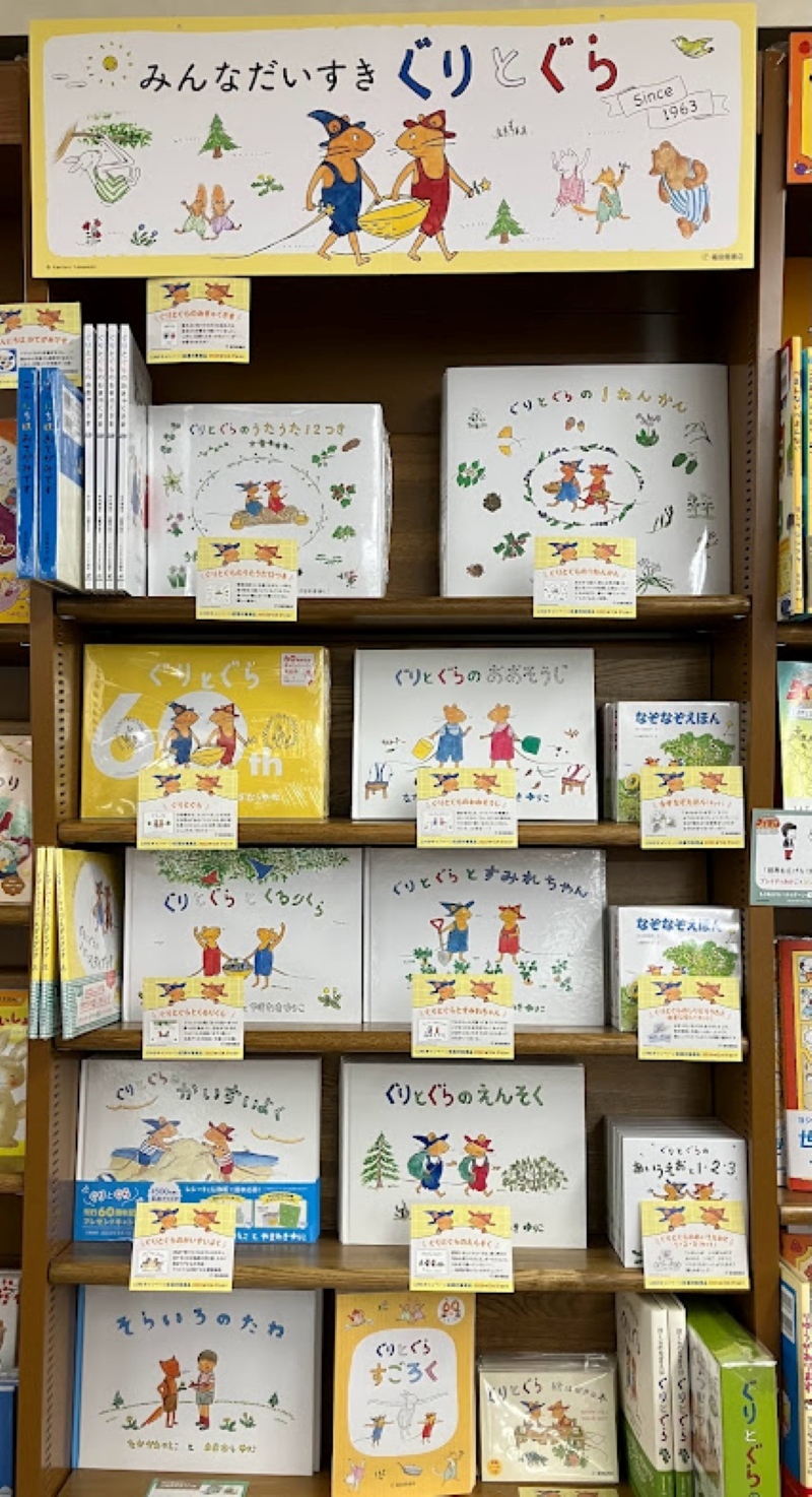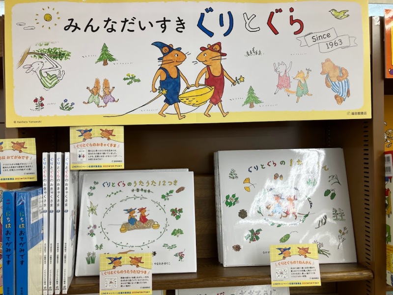 食べることが大好きなふたごの野ねずみ『ぐりとぐら』は2023年で誕生60周年を迎えました。60周年を記念して、『ぐりとぐら』シリーズ関連商品をずらりと展開中です。フリーペーパーのすごろくは無くなり次第終了いたします。懐かしくて、可愛いぐりとぐらにぜひ会いに来てください。LINEで応募するプレゼントキャンペーンも実施しております。児童書窓側フェア棚にて開催中です。ご来店お待ちしております。