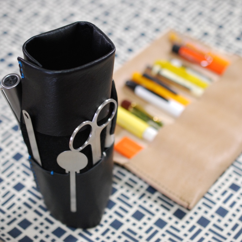 丸めて運搬、立てて活用。オーダーで人気の柔らかな一枚革のロールペンケース、タツローです。留具をスナップに仕様変更し、より作りやすく、使い心地も進化!