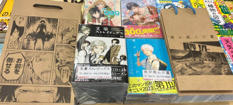 店内全てのKADOKAWAの書籍が対象!ニコニコカドカワ祭り開催中です。KADOKAWAの本を購入し、レシートをアプリで応募すると金額の30%がもれなく還元、10人に1人は全額還元の大変お得なフェアとなっております。また、文豪ストレイドッグスまとめ買い、光が死んだ夏まとめ買いにはレジにて限定ショッパーのプレゼントもございます。この機会に是非ご来店お待ちしております。