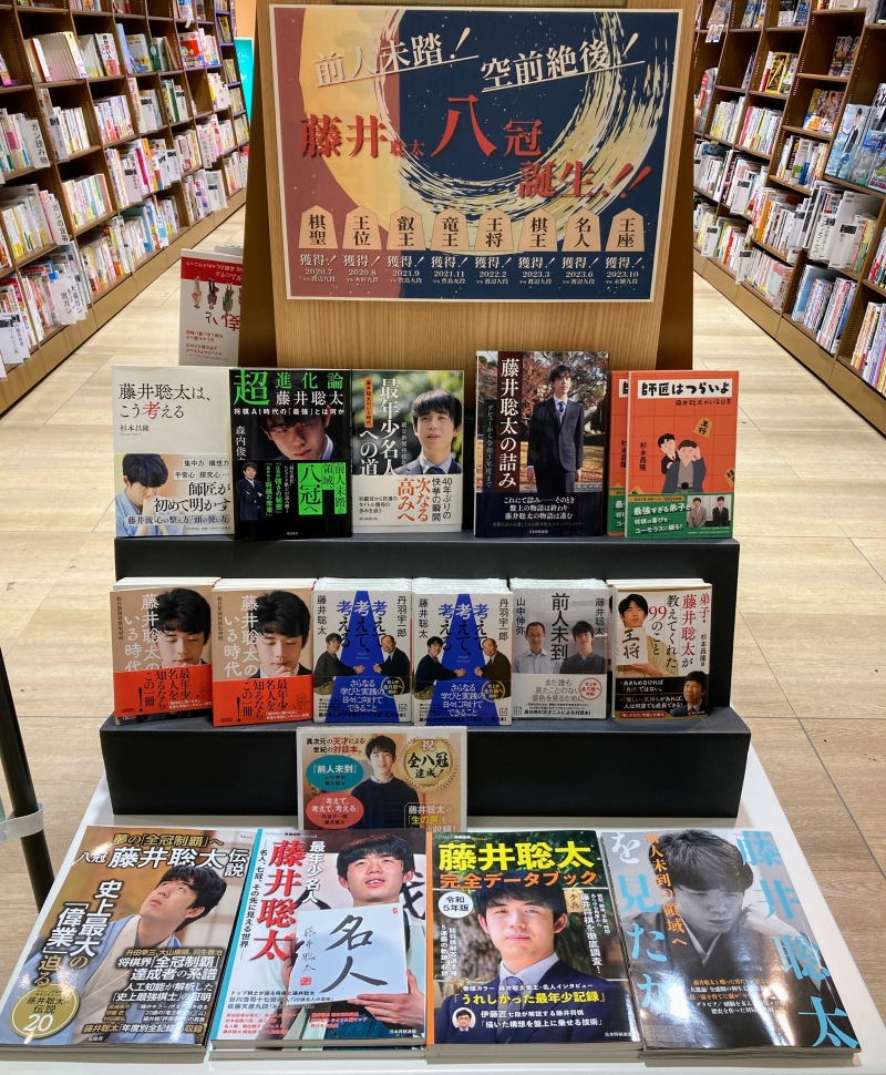 これまで数々の最年少記録を塗り替えてきた藤井聡太さん。とうとう八大タイトルを全て独占して、前人未踏の「八冠」達成となりました!レジ前の話題書コーナーと、実用書のエンド台の両方で藤井聡太八冠の関連書籍を集めたフェアを開催中です。天才を天才たらしめたものは何だったのか?考察してみませんか!