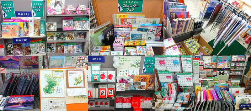 2024年版カレンダー販売中です!大切な予定を書き込んだりお部屋のインテリアとしても素敵なイラストや写真のカレンダー多数販売中です。猫や犬などの可愛らしい動物や、シンプル・イズ・ベスト!な日めくりカレンダーもございます。大判の壁掛けカレンダーは見本がハンガーに、商品はその下方に丸めて陳列してございますのでお選び下さい。(ただ人気商品はいつも無くなるのが早いですスミマセン!)お時間ある際にお立ち寄り頂きぜひご覧下さい。入口よりすぐ左手のフェアコーナーにて販売中です。皆様のご来店をお待ちしております。