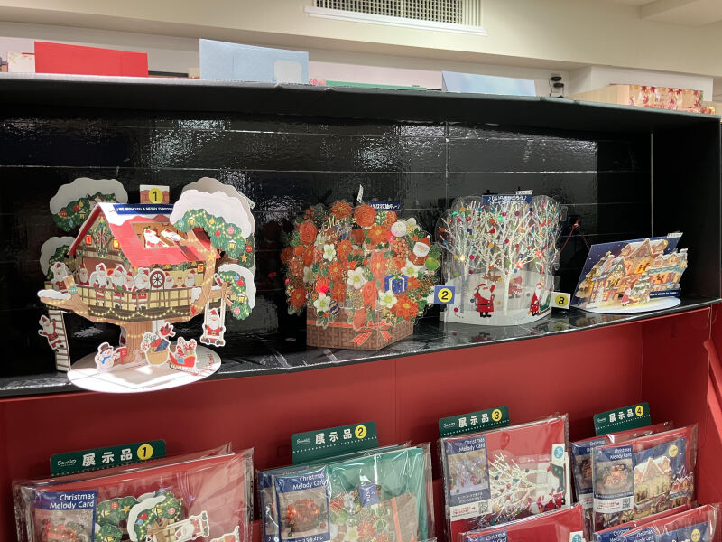 今年もクリスマスカードが豊富に入荷いたしました。人気のメロディカード、ポップアップカードから和風、キャラクター、シンプルなカードまで幅広く取り揃えております。遠方への方へのご挨拶に、クリスマスプレゼントに添えて。当店のカードを是非ご活用下さい。お品によっては品切れとなるものもございますので、お早めのお求めをおすすめいたします。