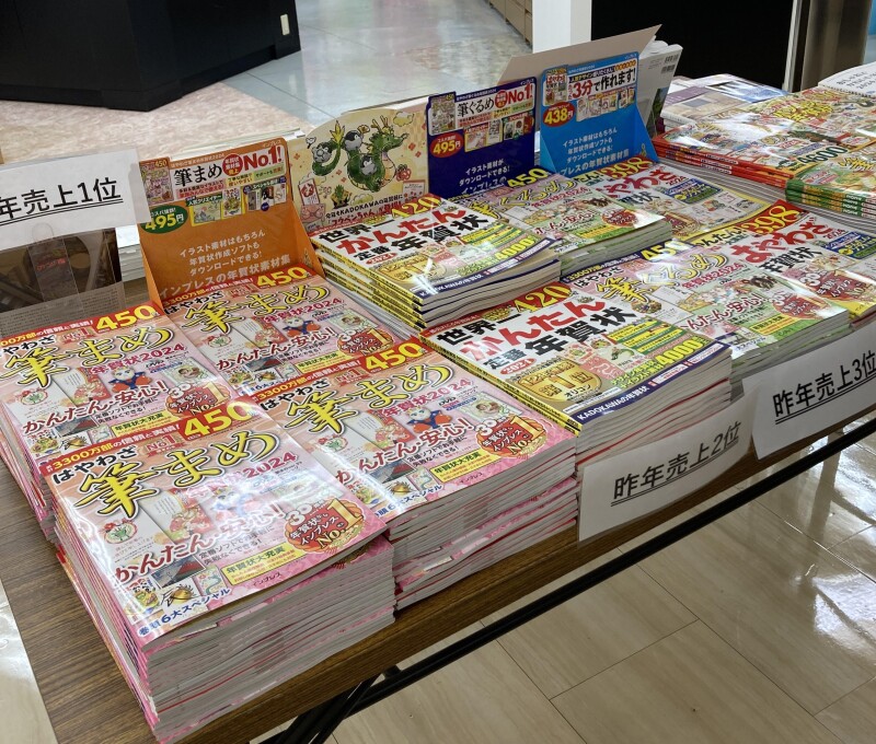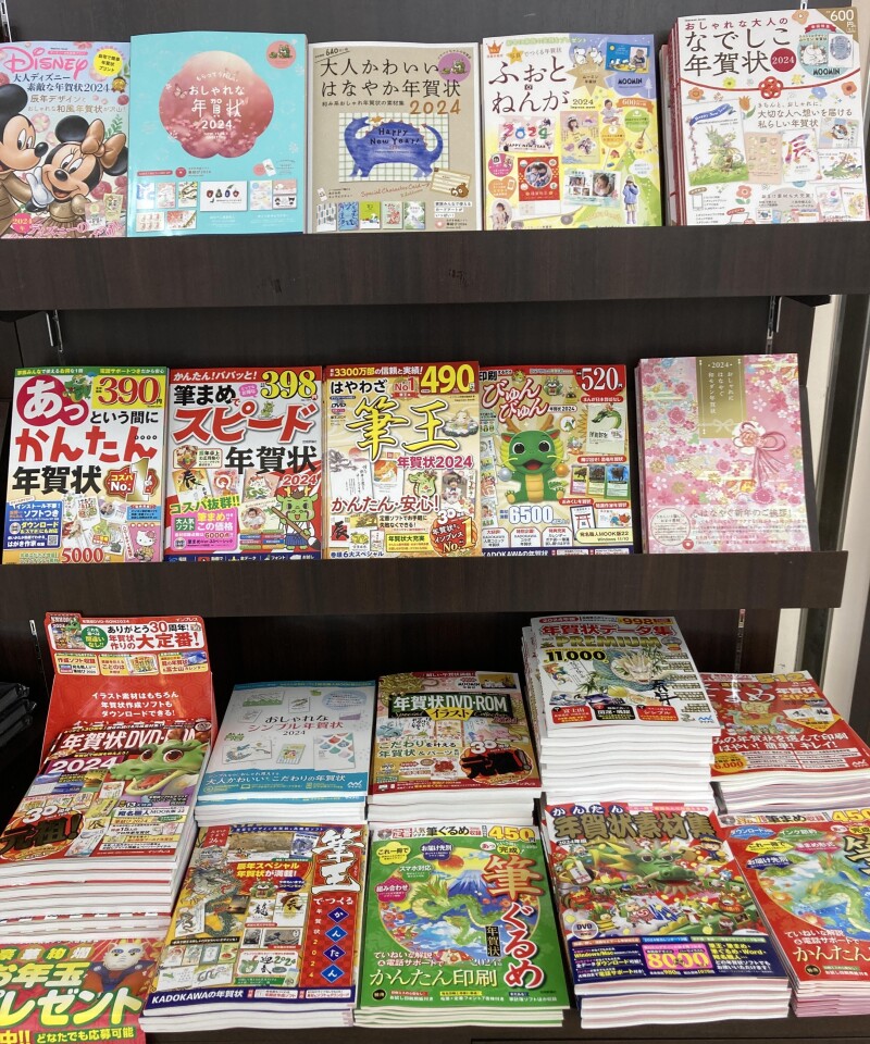 年賀状素材集が各種入荷しております。年々減少傾向にある年賀状ですが、やはり元日にいただくと嬉しいもの。すぐに連絡がつく方へでも、その人のことを考えながら1枚の年賀状を書き上げる時間が、実は大切で豊かな時間なのかもしれません。2024年の干支は辰です。当店地下3階にて展開しております。ぜひご覧下さいませ。