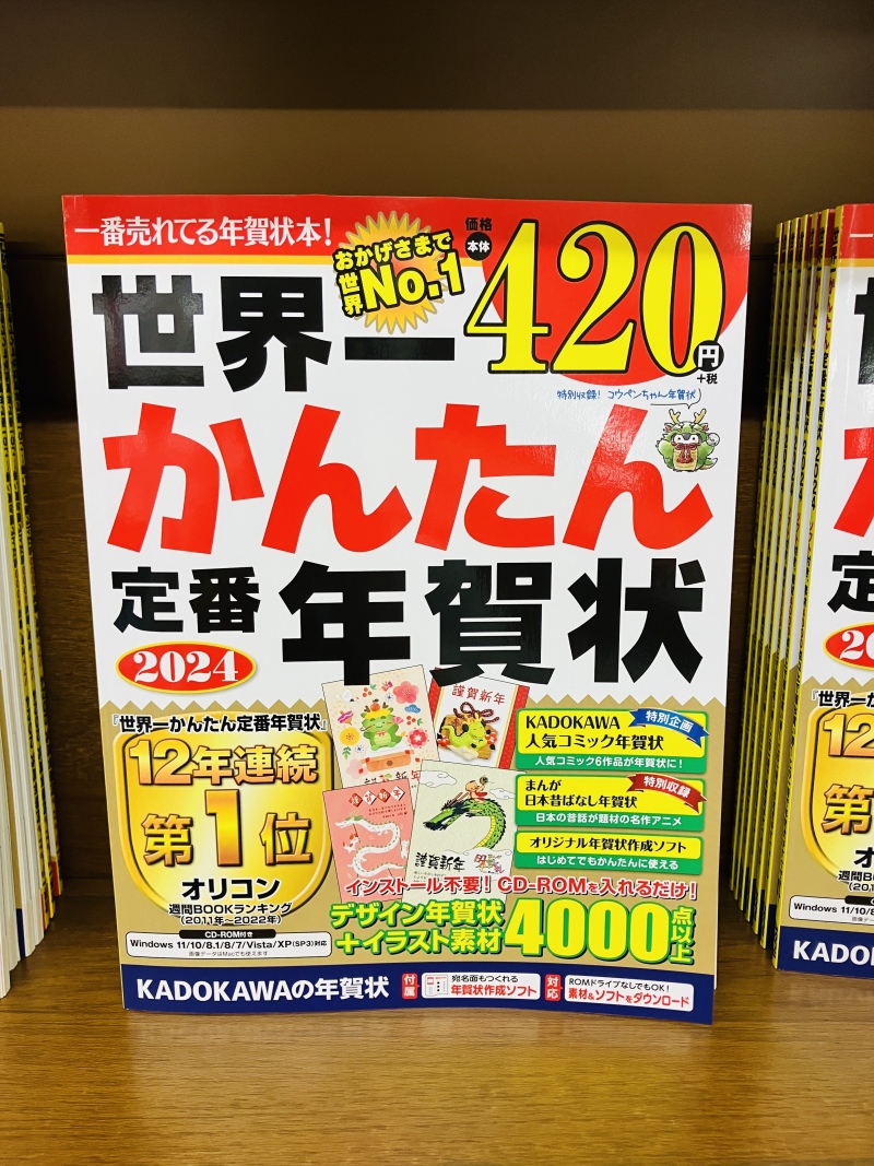 元日という特別な日に年賀状が届くと嬉しいですよね。年賀状はいつもお世話になっている人に日頃の感謝を伝える良い機会でもあります。せっかく送るなら絵柄や文章にこだわった自分だけの年賀状を送りませんか?当店では毎年大人気の【DVD付き年賀状素材集フェア】を開催中です。パソコンで年賀状を作る皆様にも、メールやLINEで新年の挨拶を送る皆様にもおすすめの商品を揃えました。易しい図解が特徴の「世界一かんたん定番年賀状2024」(KADOKAWA)は、初めてパソコンで年賀状を作る人におすすめです。またスマホで使える年賀状素材が掲載された「おしゃれでかわいい年賀状」(マイナビ出版)はパソコンを持っていない人やメールで新年の挨拶を送る人におすすめです。いつもは年賀状を作っていない人も今年は少しの手間と心を込めて自分だけの年賀状を送ってみてはいかがでしょうか。地下1階コンピューター3の棚にて開催中です。