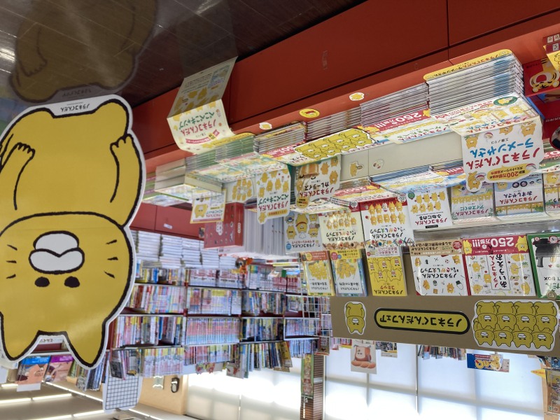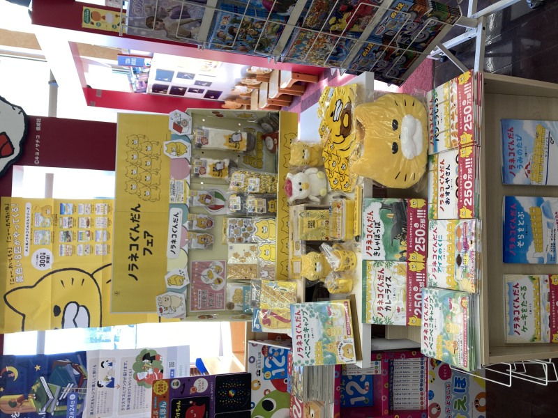 現在当店の児童書売り場は黄色が目立ちます。そう、子どもから大人まで大人気のあいつらのしわざ。シリーズ最新作「ノラネコぐんだん ぺこぺこキャンプ」好評発売中のノラネコぐんだんフェアを開催中です。関連本の他に文具や雑貨などグッズも販売中。児童書コーナーで巨大パネルがお出迎え。一緒に写真撮影もOKです。