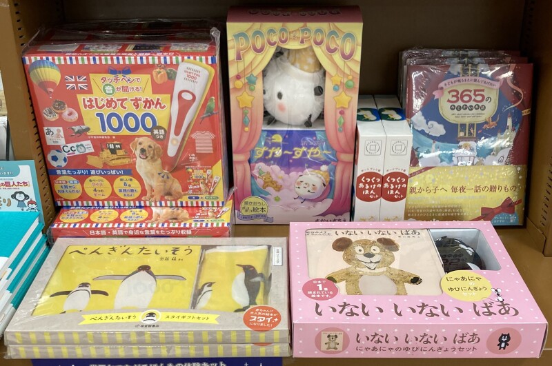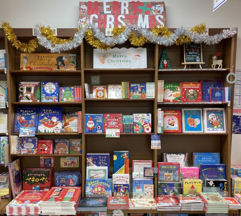 クリスマスプレゼントに絵本はいかがでしょうか?児童書フェア棚では、「ノンタン」「アンパンマン」などの定番書やしかけ絵本、大人から子供まで楽しめるクリスマスにちなんだ本を取り揃えました。「おべんとうバス」「しろくまのパンツ」などクリスマスが待ち遠しくなる絵本もあります。この機会に、ぜひお立ち寄りください!