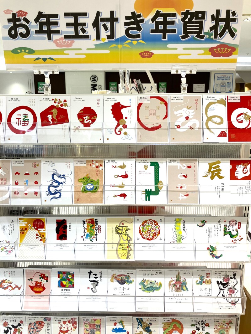 当店にも年賀用品が入荷しております!お年玉付き年賀状や、切手が必要な私製年賀状はもちろん、ポチ袋は干支をモチーフにしたものだけではなく、スーパーマリオやハローキティなどの可愛らしいキャラクターのものから、刺繍やポップアップするものまで幅広いラインナップでご用意しております。年賀スタンプや干支小物もぜひ。季節商品のため、数に限りがございますので、お早めに店頭でご覧くださいませ。ご来店お待ちしております!