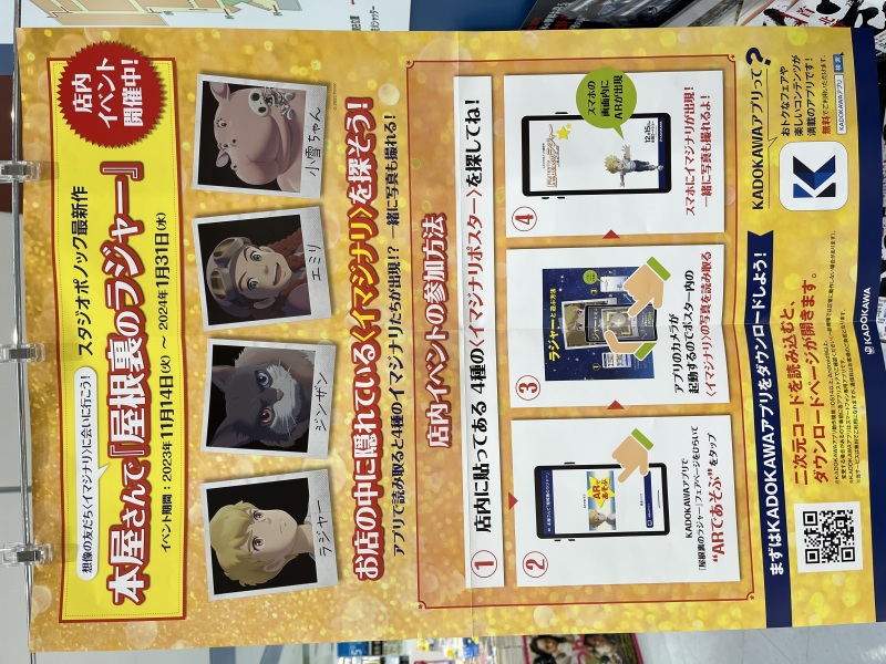 店内に貼ってある4種の〈イマジナリポスター〉を探して、KADOKAWAアプリで写真を読み取ると、スマホに〈イマジナリ〉が出現する楽しいイベントになっていますので、ぜひぜひご参加くださいませ。