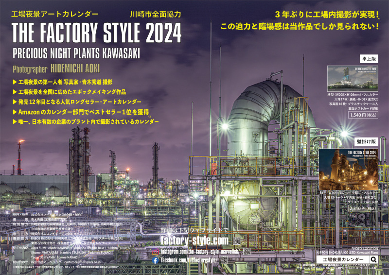 工場夜景写真の第一人者、青木秀道氏の作品を集めたフォトアートカレンダー「THE FACTORY STYLE 2024 -PRECIOUS NIGHT PLANTS KAWASAKI- 」。当店に入荷しております。2024年版は3年ぶりに場内撮影を敢行。世界のNikonの全面協力も得て、かつてないクオリティの今作。ネットでは見る事のできない唯一無二の素晴らしいショットは、工場夜景ファンの期待を裏切らない出来栄え。壁掛版2,310円と卓上版1,540円、2種類でのご用意。用途に合わせて工場夜景をお楽しみいただける仕様となっております。