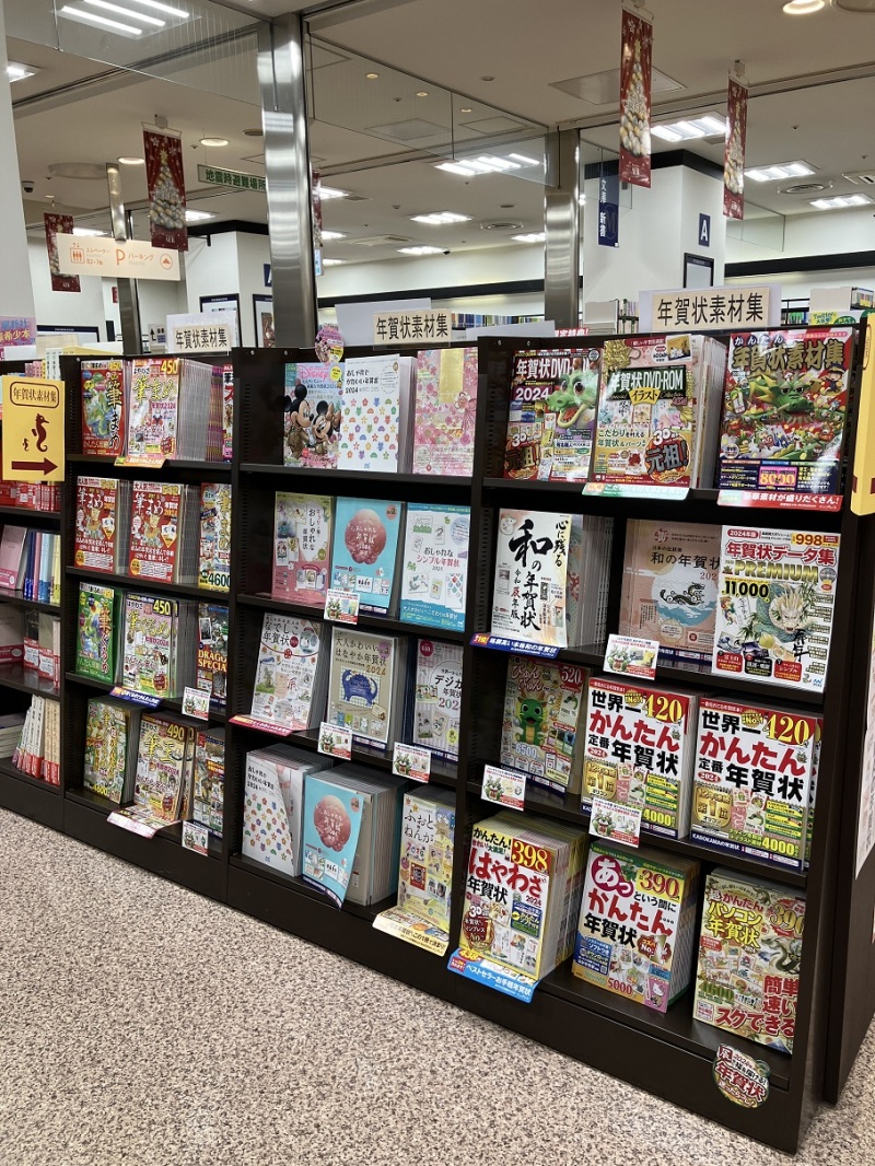 毎年売れ筋の『世界一かんたん定番年賀状』(KADOKAWA)から、宛名ソフト「筆まめ」「筆ぐるめ」「筆王」対応の各種素材集、デザイン重視の和柄素材集、ディズニー素材集のほか、お手頃価格のものも各種とり揃えております。どんな柄の年賀状にしようかまだ迷っているという方も、これを見れば何か見つかるはず!レジ前フェア棚で展開中です。どうぞお立ち寄りください。