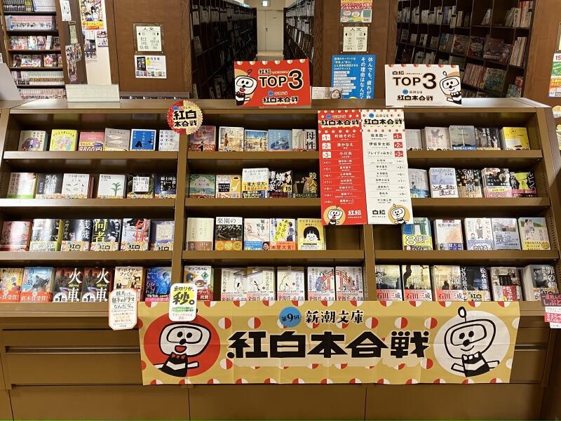 第9回 新潮文庫 紅白本合戦。紅組は2023年 女性に売れた本 TOP10。白組は2023年 男性に売れた本 TOP10。まずは紅組 女性に売れた本 第一位は『ぎょらん』(町田そのこ)。対する白組 男性に売れた本 第一位は『音楽は自由にする』(坂本龍一)。となっております。ロングセラーの『暇と退屈の倫理学』(國分功一郎)が紅組の第4位に、今年は『同時代論集』の刊行が話題となった大江健三郎の『死者の奢り・飼育』が白組の第10位に入っております。レジ前 フェア棚にて展開しております。ご来店の際には是非お立ち寄りくださいませ。
