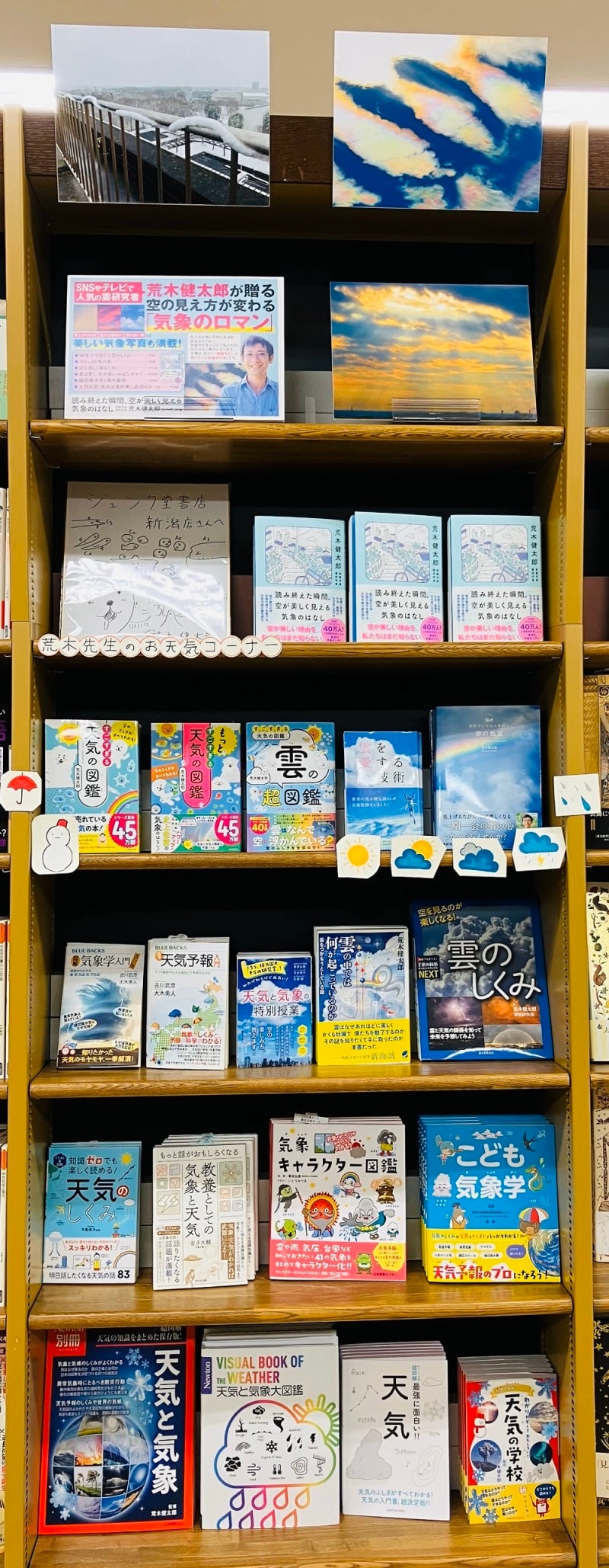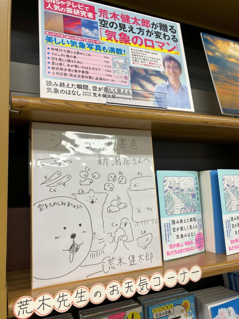 冬の雷は北欧、そして日本の北陸地方に見られる程度の世界的にも珍しいものとされています。と、このように天気の話題は不変で尽きないものです。雲や気象関連の書籍をまとめた棚が地下階話題書コーナーにて展開中。気象の書籍をいくつも手掛けた荒木健太郎氏の著書を中心としたラインナップです。著者直筆のサイン色紙も展示中ですので、どうぞ書籍と合わせて御覧ください。季節は変われど空は常に共にあります。ふと見上げた空、雲の名前がわかるといつもと景色変わって見えるかもしれません。ぜひお立ち寄り下さい。