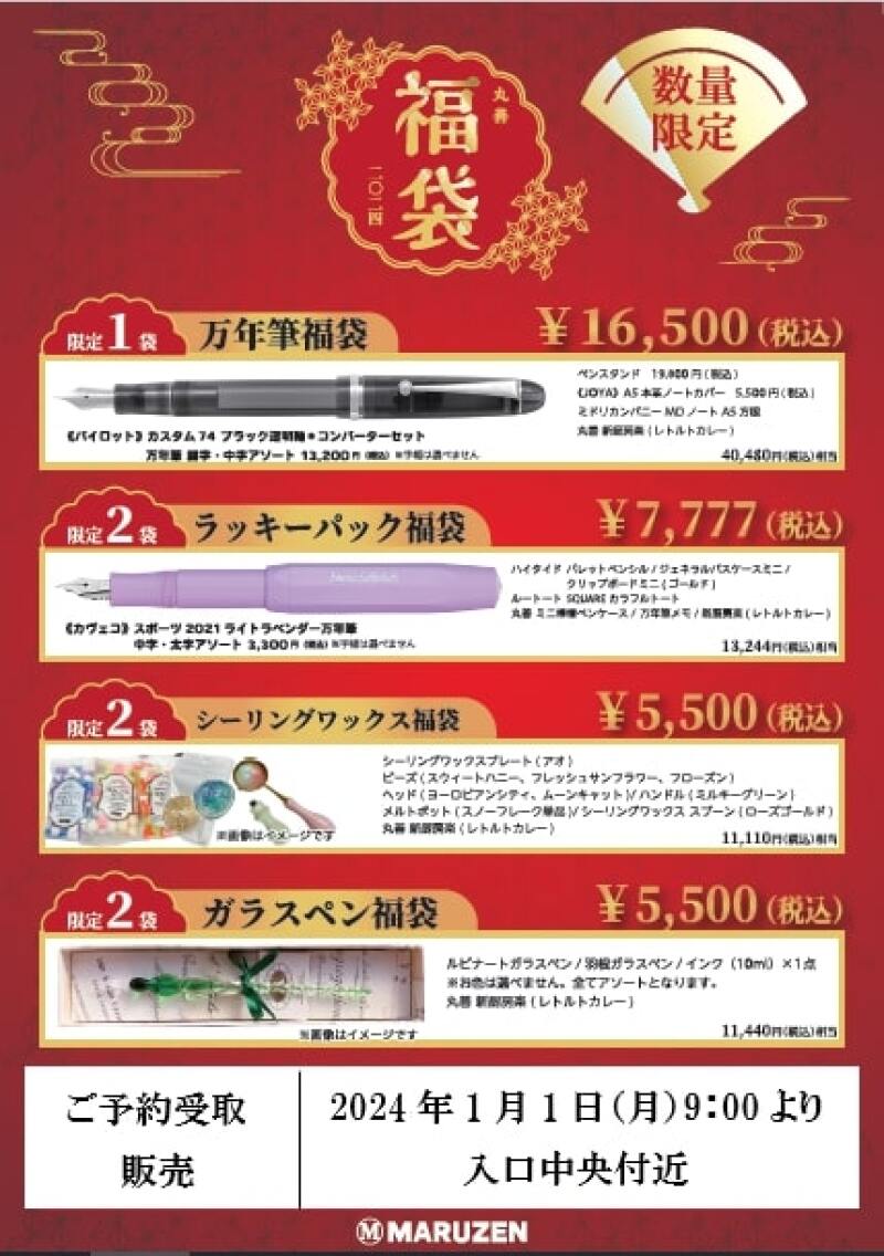 毎年恒例の筆記具をメインとした「丸善福袋」。万年筆やガラスペンに加え、今回はシーリングワックス福袋が登場しました。また、かわいいキャラクターのハッピーバッグなど、お子様にもお喜びいただける楽しい福袋を豊富に取り揃えて皆様のご来店をお待ちいたしております。