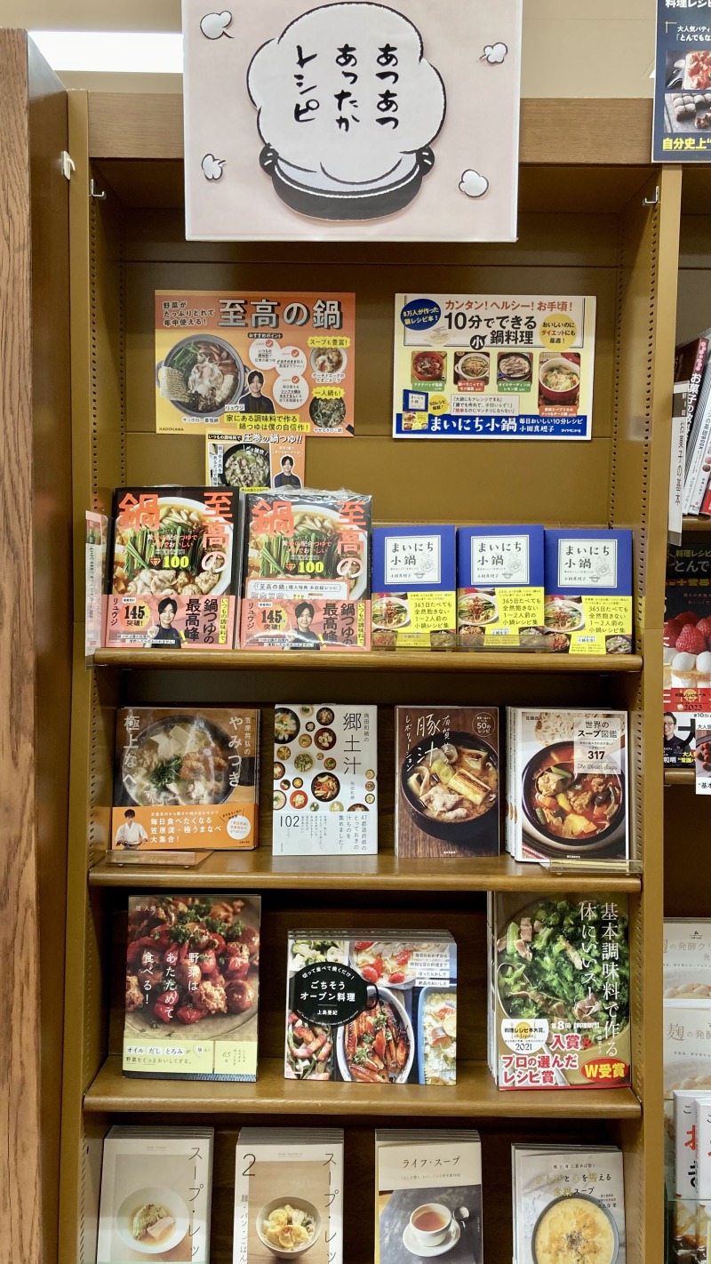 寒い冬の夜には温かい鍋やスープが恋しいですよね。6F実用書8番の棚にて「あつあつあったかレシピ」フェアを開催しています。担当スタッフのオススメは全国に伝わる汁ものを102レシピ集めた料理研究家・飛田和緒さんの力作『郷土汁』です。同じものを作りがちな汁もののレシピの幅がぐんと広がります!ぜひお立ち寄りください。