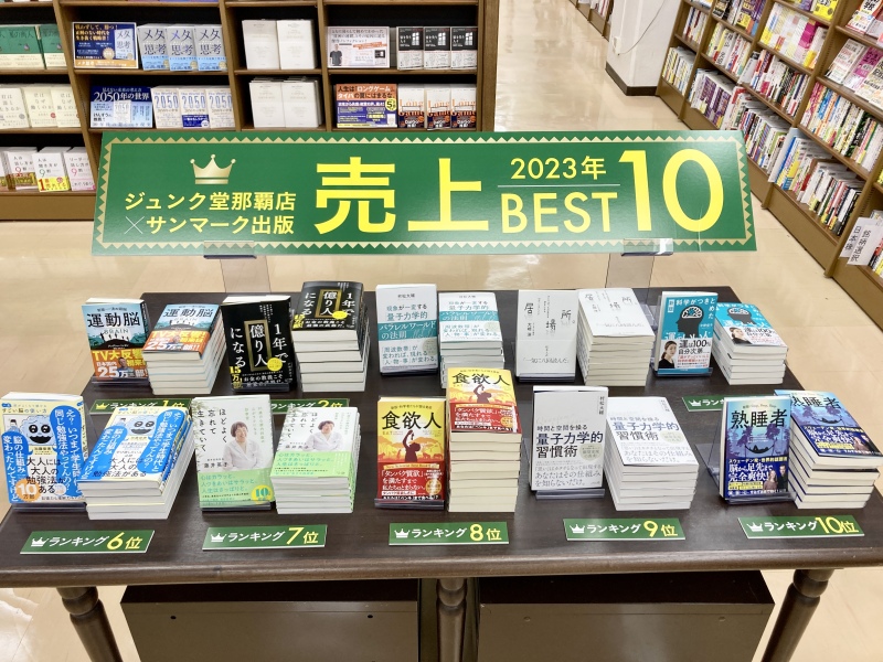「手のひらに、一冊のエネルギー。」をスローガンに、ビジネス書・実用書・人文書などでさまざまなタイトルを出版しているサンマーク出版とオールジャンル150万冊の店内在庫を誇るジュンク堂書店那覇店がコラボレーション。2023年に最も売れた本をベスト10のランキングでご紹介しております。この機会に読んでみたかった、というタイトルがずらり。ぜひお手に取ってご覧ください。
