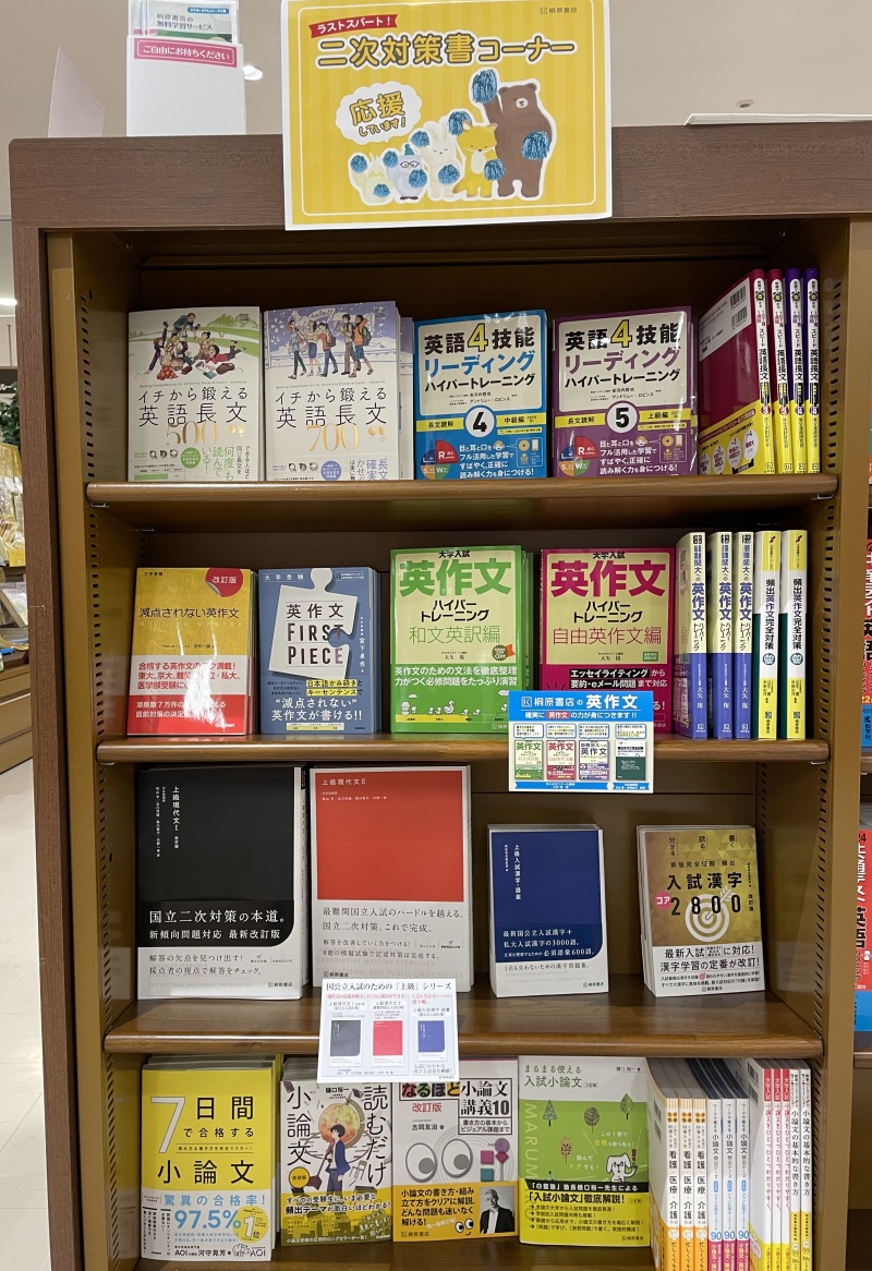 いよいよ受験勉強もラストスパートですね。共通テストが終わったら、次は二次試験・私立大入試向けの対策をしませんか。英作文、英語長文、小論文、現代文を中心にそろえました。少しでもお力になれるような問題集をご用意しております。学習参考書売り場フェア棚にて展開中です。